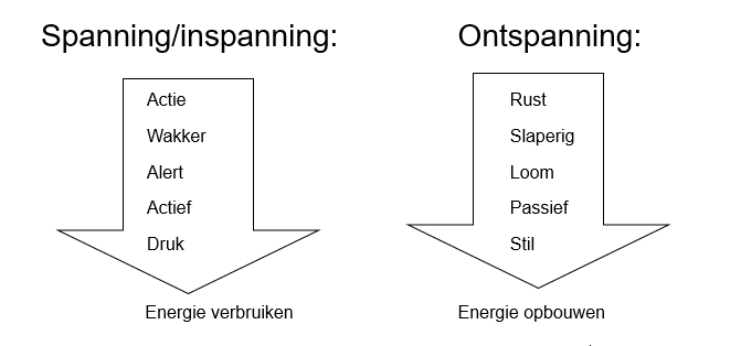 In de tabel staat weergegeven hoe het lichaam reageert op inspanning, spanning en ontspanning. Hierbij valt op dat bij inspanning en spanning in het lichaam nagenoeg dezelfde reacties optreden (hierbij wordt energie verbruikt), terwijl ontspanning juist een tegengestelde werking laat zien.